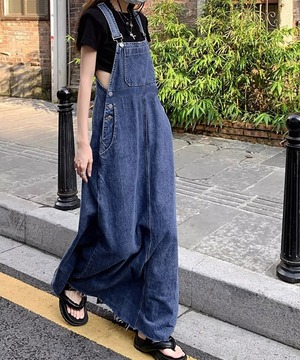 ゆったりとしたシルエット、カジュアルでリラックスしたスタイリングにぴったりのロング丈デニムサロペットスカート