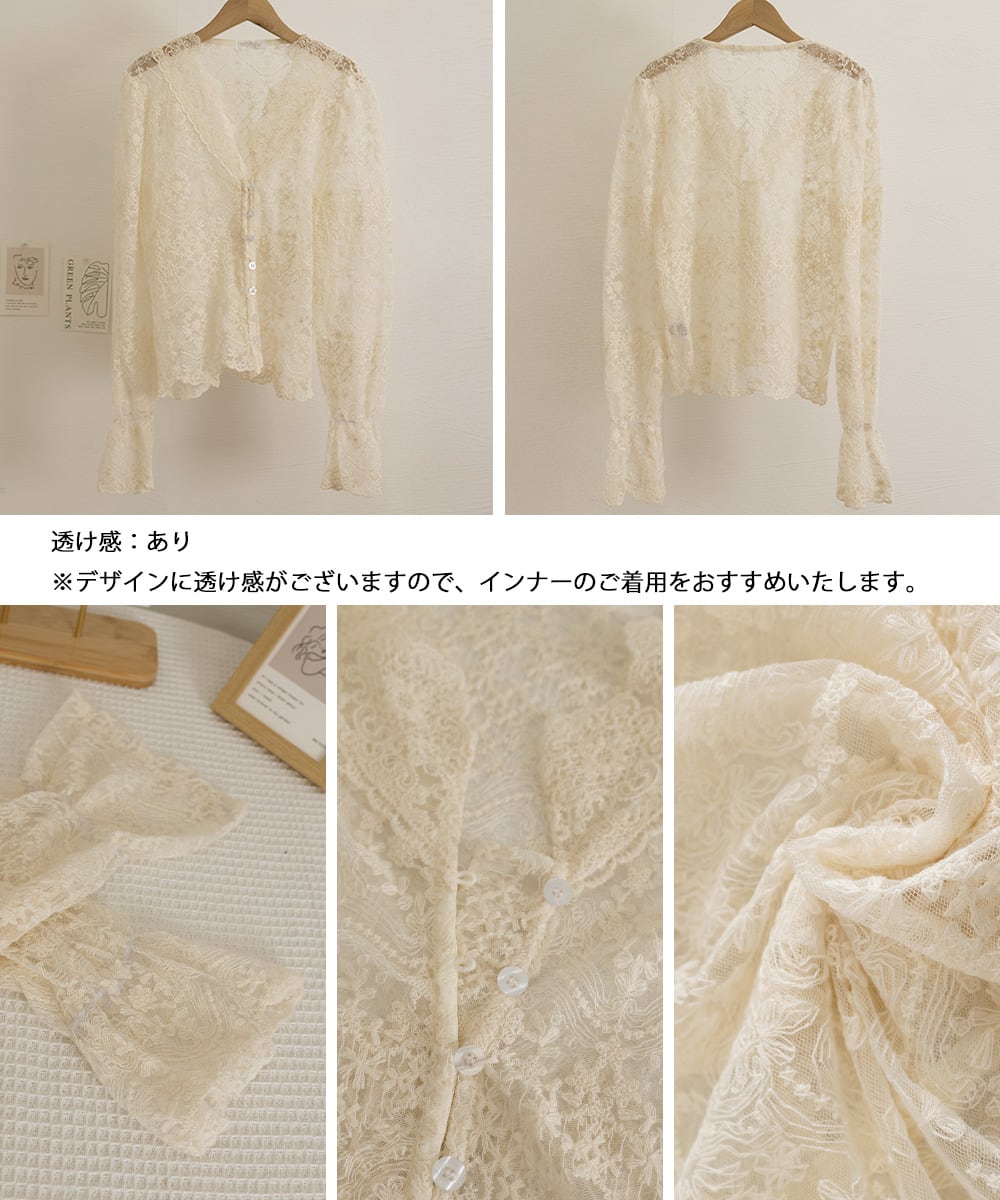 軽やかで繊細な花柄レース生地を使用したVネックのキャンディスリーブシアーブラウス