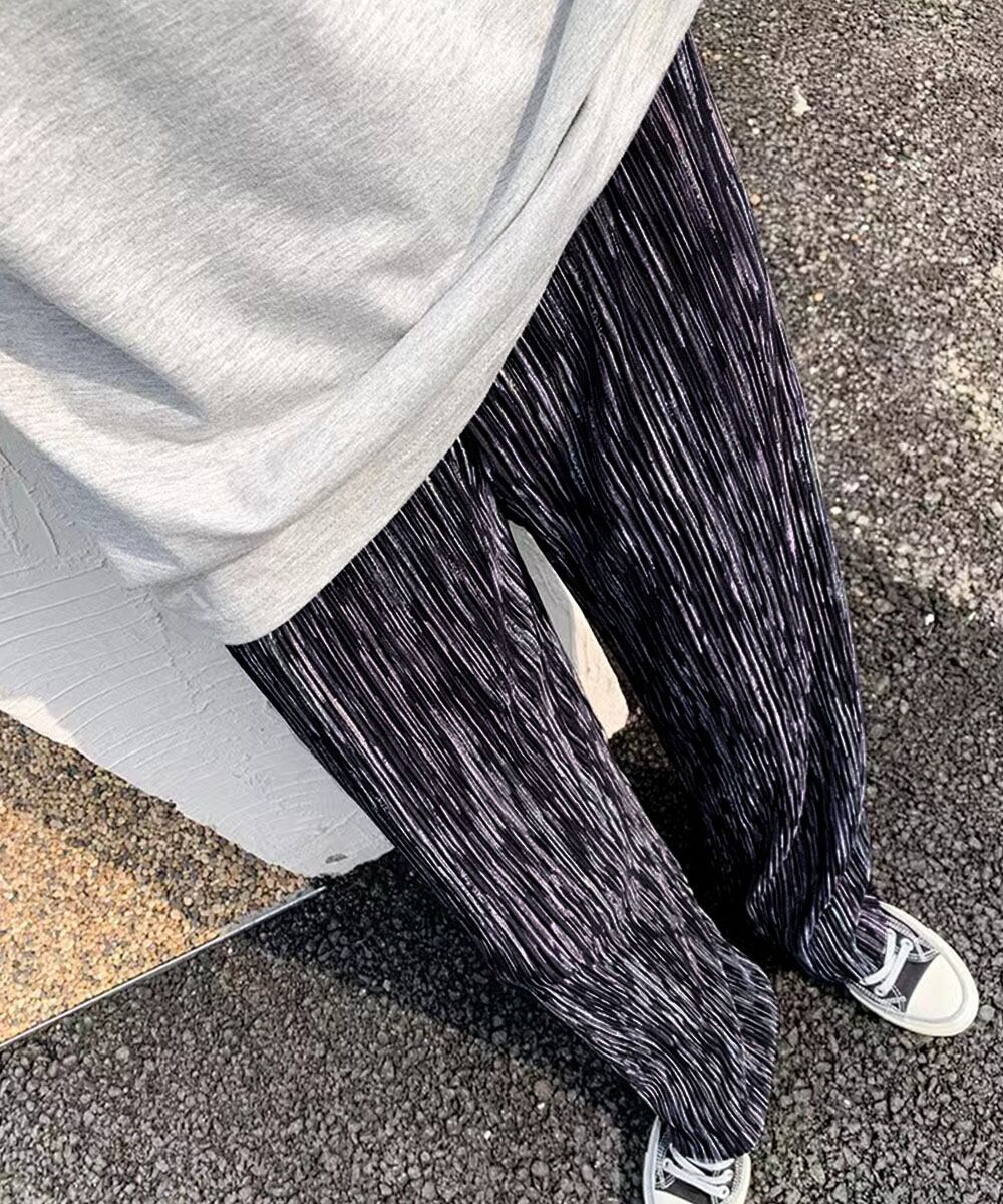 光と影が織りなす独特の質感を持つ、プリーツ加工のワイドパンツ。