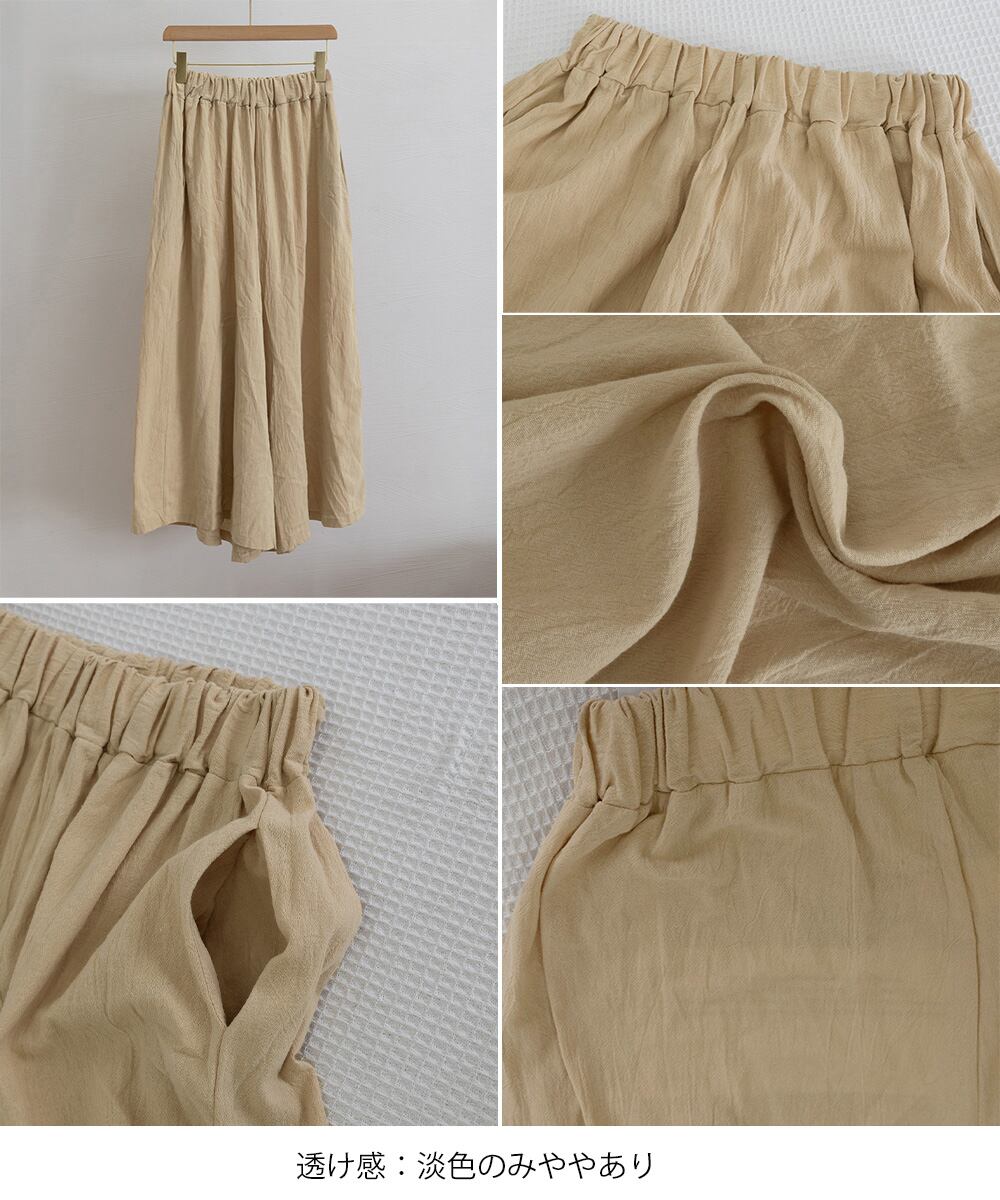 ウエストはゴム仕様、両サイドにポケット付きで、毎日にうれしい使い勝手の良さ。
