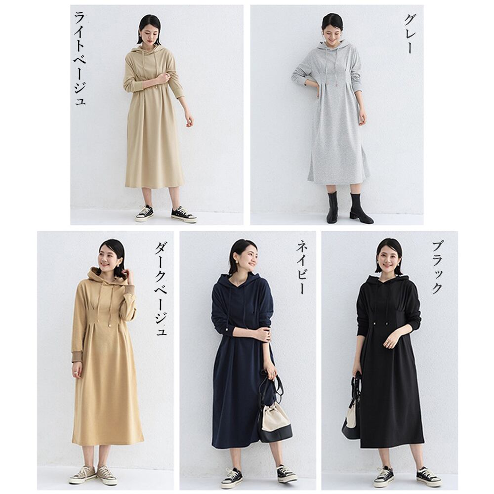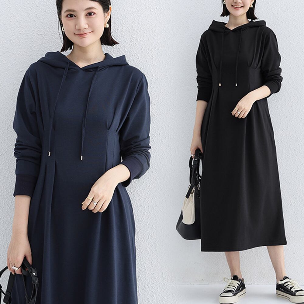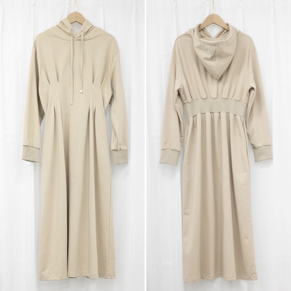 パーカーのラフさとワンピースのガーリーさが絶妙にミックスしたフーディースウェットワンピース。
