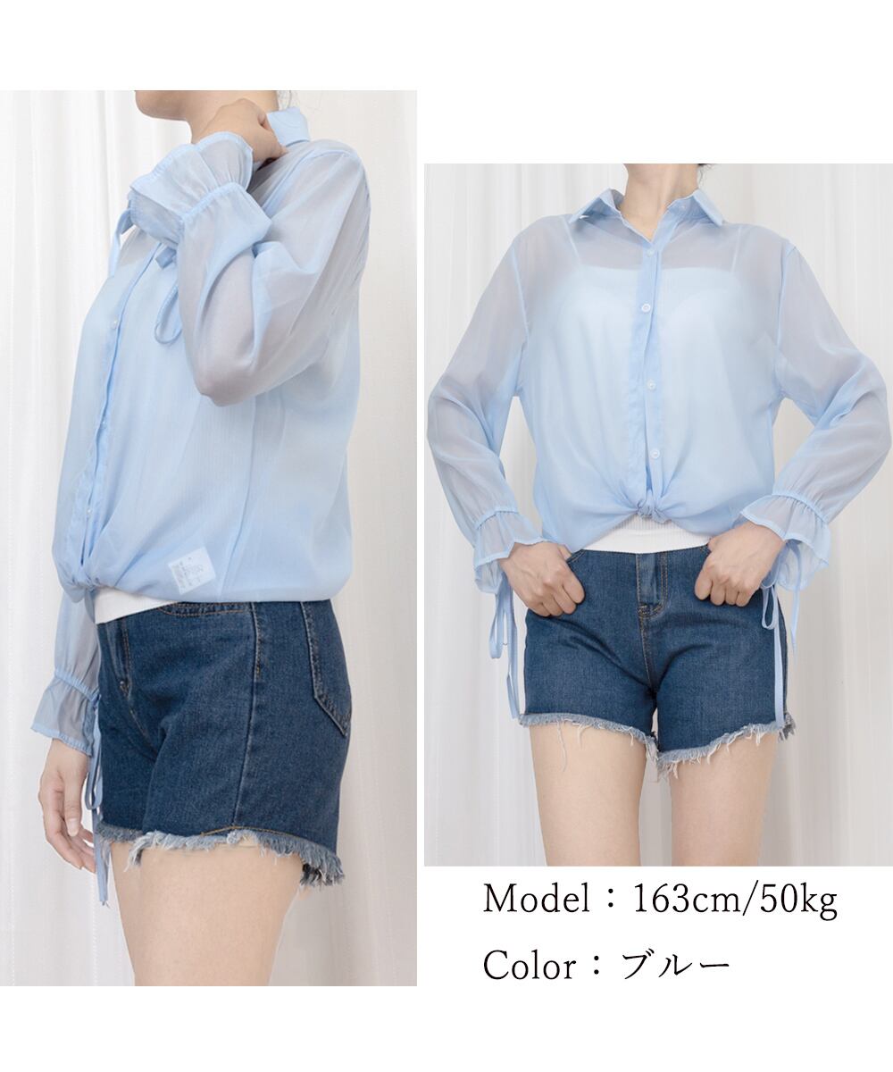 透け感のあるシアー生地が魅力の、大人可愛いシャツブラウス。