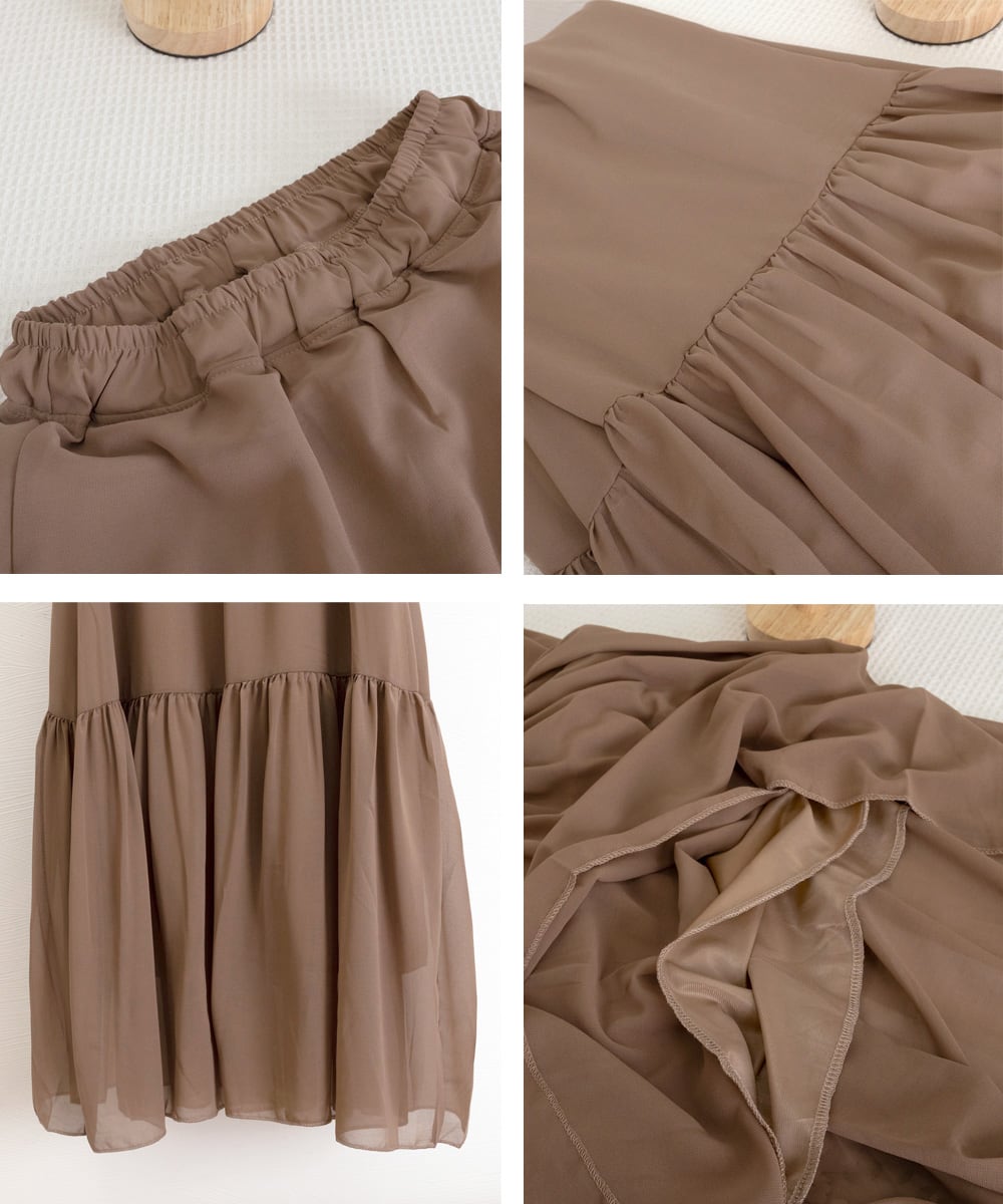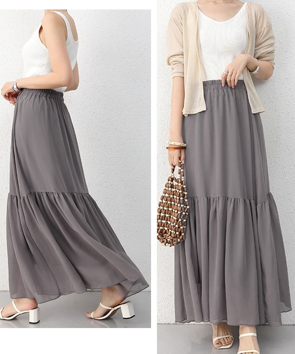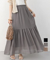 エアリーなシフォン素材が、女性らしさを引き立てるティアードスカート。
