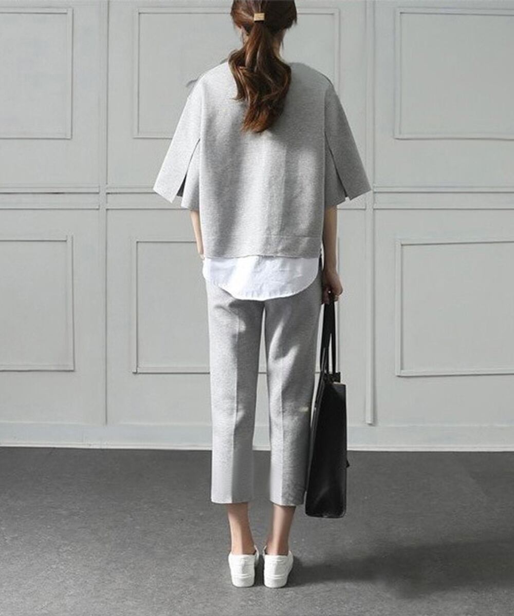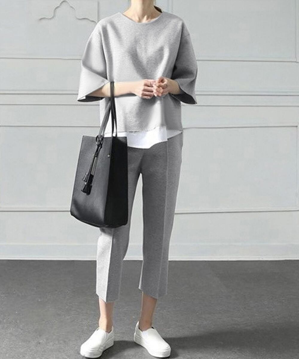 レイヤード風デザインの7分袖カットソーと、センタープレスパンツの大人カジュアルなセットアップ。