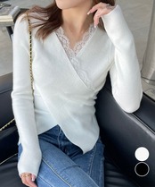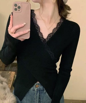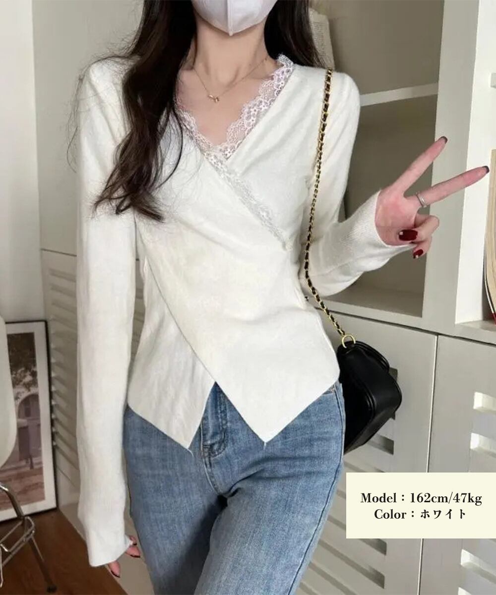 Vネックのデザインで顔まわりをすっきり見せ、フェミニンさをプラス。
