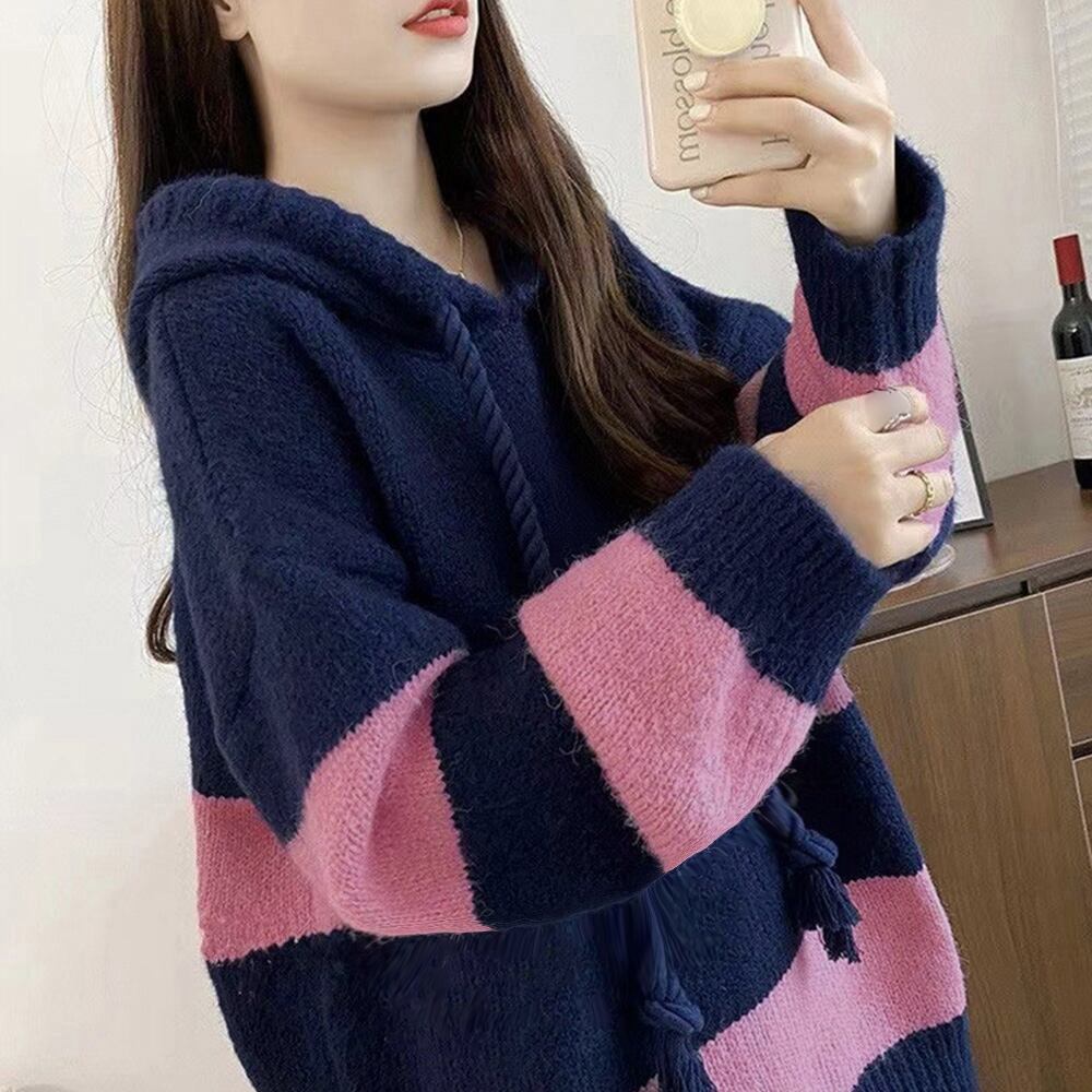 ゆったりとしたシルエットでこなれ感のあるフード付きニットパーカー